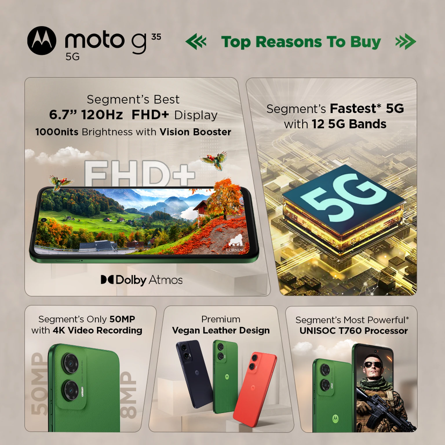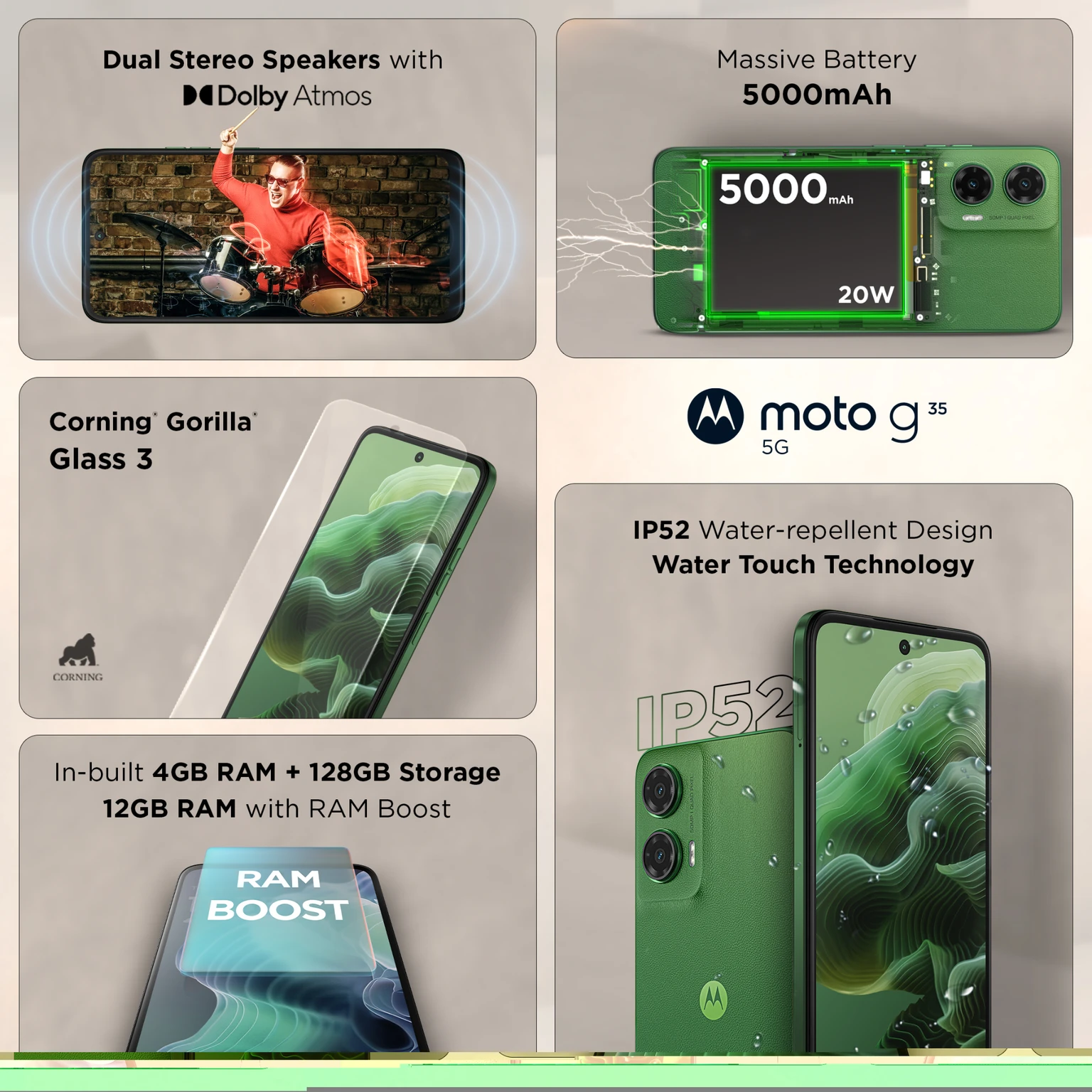 RAM Boost, Body: 3D PMMA, IP52 Water Protection, Vison Booster, Charging: 18W, QC, PD, Dual Microphones, Personalize: Theme, Wallpaper, Layout, Fonts, Colors, Icon Shape, Display Size and Text, Sounds, Dark Mode, Display: Attentive Display, Lock Screen, Gestures: Quick Capture, Fast Flashlight, Three Finger Screenshot, Flip for DND, Pick Up to Silence, Lift to Unlock, Swipe to Split, Quick Launch, Sidebar, Moto Secure: Secure Folder, Phishing Detection, Auto Lock, Network Protection, Lock Screen Security, Pin Pad Scramble, Privacy Dashboard, Security & Privacy, Permission Manager, Privacy Controls, Play: Media Controls, Games, Tips: Take a Tour, What's New in Android 14, Voice Control: Google Assistant