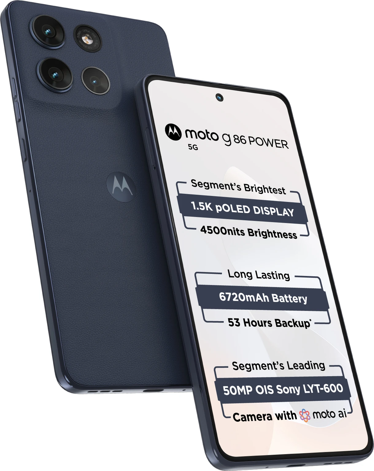 Dual Camera Setup: 50MP Main Camera (Sony LYTIA 600 Sensor, f/1.88 Aperture, 0.8um Pixel Size, Quad Pixel Technology for 1.6um, Quad PDAF, Optical Image Stabilization (OIS)) + 8MP Ultrawide Angle Camera (FOV: 118 Degree, Macro Vision, f/2.2 Aperture, 1.12um Pixel Size) + 3-in-1 Flicker Sensor, Features: Ultra-Res, Portrait, Pro, 360 Degree Panorama, Night Vision, Scan (Powered by Adobe Scan), Tilt Shift, Artificial Intelligence (Moto AI Processing, Auto Smile Capture, Google Lens Integration, Auto Night Vision), Other Features (HDR, RAW Output, Live Photo Filters, Burst Shot, Timer, Assistive Grid, Leveler, Metering Mode, Watermark, QR/Barcode Scanner, Quick Capture (Twist-Twist), Audio Zoom, Video Features: Timelapse (W/Hyperlapse), Slow Motion, Dual Capture Video, Other Features (Video Stabilization, Video Snapshot, Audio Zoom)