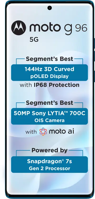 Experience the 144 Hz, 3D curved pOLED display with the advanced display color boost technology. The moto g96 5G, featuring the impressive 3D Curved Display. This engineering marvel boasts a 144Hz pOLED screen protected by ultra-durable IP68 underwater protection, accompanied by the most advanced water touch technology, and also has ultra-reliable Corning Gorilla Glass 5. The elegantly curved display provides an immersive viewing experience with its 1600nits brightness and Indulge in captivating entertainment on a 16.67 cm pOLED FHD+ ultra vivid display that has deeper blacks, bringing images to life with life-like clarity. The cinematic Billion Colour 10-Bit Display with 100% DCI-P3 works its magic to bring every moment to life, and SGS eye protection gives added protection to your eyes.